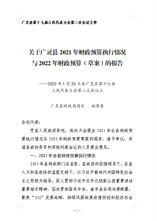 標題: 關于廣靈縣2021年財政預算執行情況與2022年財政預算草案的報告