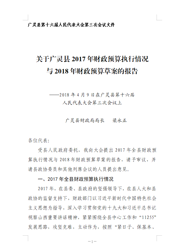 關于廣靈縣2017年財政預算執行情況與2018年財政預算草案的報告